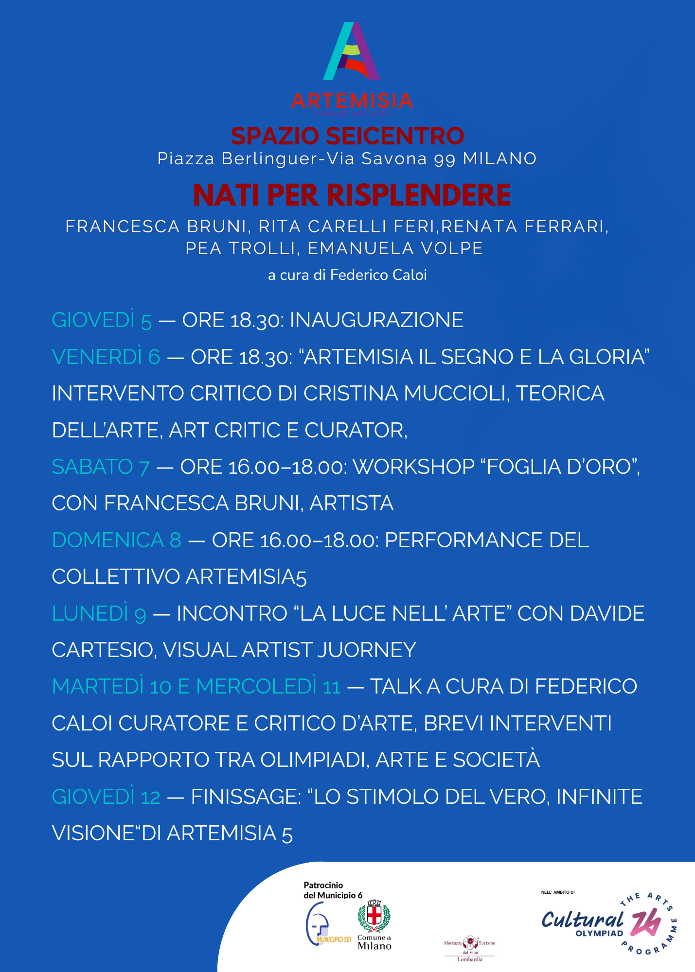 - Domenica 8 — ore 16.00–18.00: performance del collettivo Artemisia 5