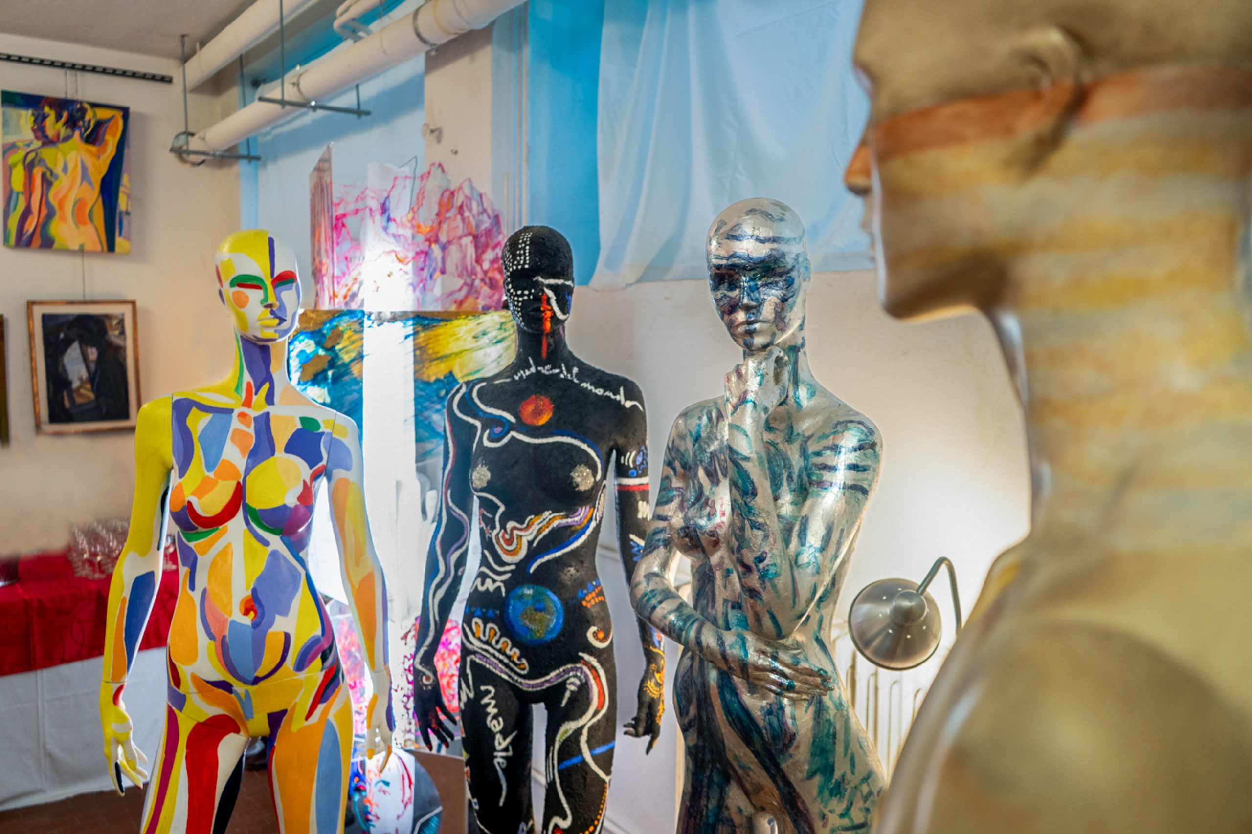 Il cuore del progetto è un’installazione composta da cinque figure dipinte, corpi-simbolo che rimandano idealmente ai cinque continenti olimpionici: una metafora visiva della pluralità culturale che i Giochi Olimpici rappresentano, e insieme un richiamo alla dimensione universale dell’esperienza umana. Non un inno alla vittoria come dominio, ma alla vittoria come superamento di sé, come atto di consapevolezza e di misura.